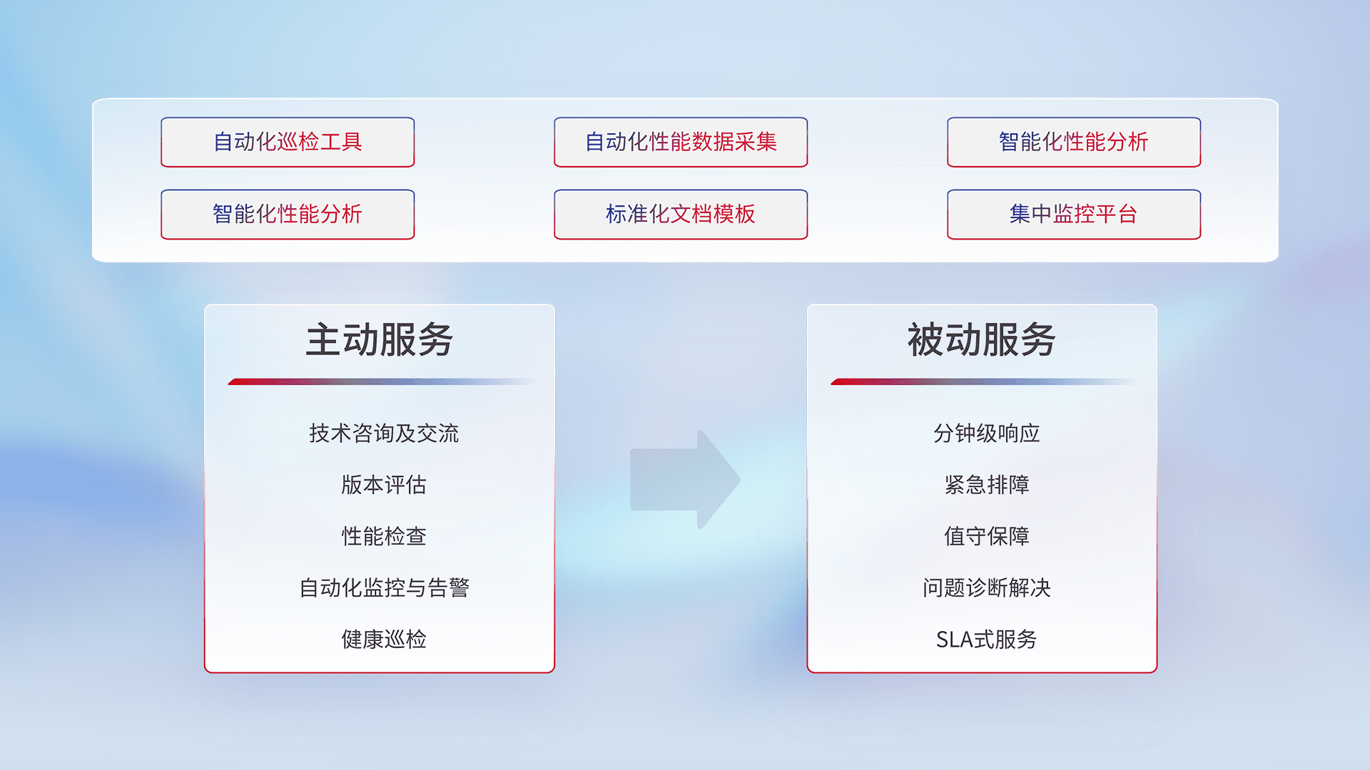 智能化工具和标准化文档,,保障服务质量,,,提供主动服务(包含技术咨询、、版本评估、、、、性能检查、、、、自动化监控与告警、、、健康巡检)和被动服务包含(分钟级响应、、、、紧急排障、、值守保障、、问题诊断解决、、、、SLA服务)。。。