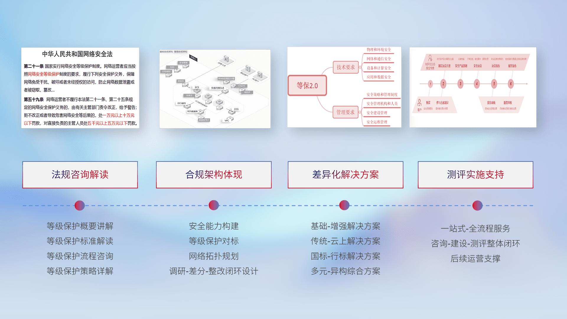 通过专业的法律咨询解读、、、合规架构体现、、、差异化解决方案、、测试实施支持等服务,,为客户量身打造等保合规体系。。。。