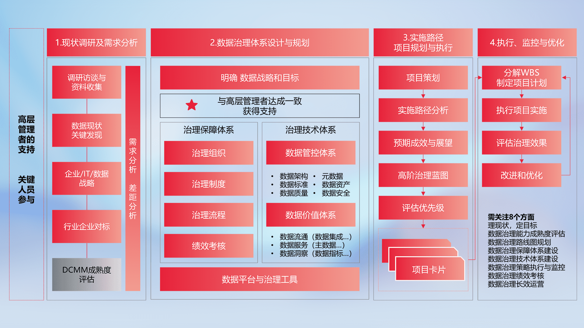 制定并执行统一的数据标准,,,规范数据定义和格式,,,,消除冗余和不一致性,,,,实现跨部门和跨系统的数据一致性,,为企业提供标准化的数据基础。。
